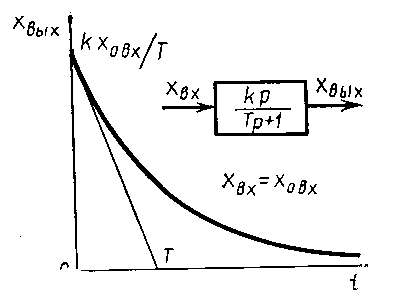 Рисунок 11. Передаточная функция и переходной процесс реального интегрирующего звена. На рис.11 представлен характер изменения выходной величины xВЫХ реального интегрирующего звена при подаче на вход постоянного сигнала x0ВХ Реальное дифференцирующее звено. Дифференциальное уравнение реальное дифференцирующего звена имеет видT dxВЫХ / dt + xВЫХ = k dxВХ / dt (21)С учётом этого передаточная функция звенаW (p) = k p / (T p + 1) (22)Таким образом, реальное дифференцирующее звено можно рассматривать как последовательное соединение идеального дифференцирующего звена и апериодического звена. При этом, чем меньше постоянная времени Т, тем больше реальное дифференцирующее звено приближается к идеальному дифференцирующему.