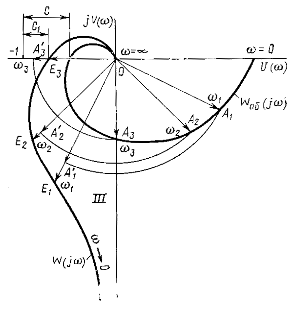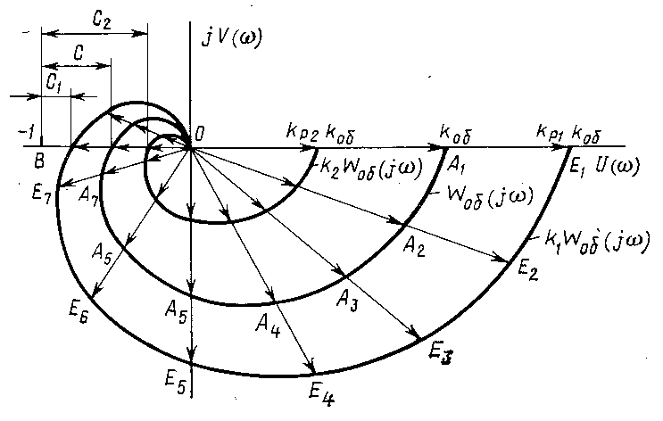 Рисунок 14. Характер изменения КЧХ разомкнутой системы с П-регулятором. На рис.14 представлены КЧХ разомкнутой системы с П-регулятором. При kP = 1 КЧХ разомкнутой системы совпадает с КЧХ объекта регулирования. При kP > 1 КЧХ разомкнутой системы приближается к точке В(-1, j 0); при kP < 1 отходит от этой точки. В качестве примера на рис.14 изображены две КЧХ разомкнутой системы при kP = kP1 = 1,5 и kP = kP2 = 0,5. В соответствии с W (j w) = kP WОБ (j w) на рис.14, например, вектор КЧХ разомкнутой системы равен ОЕ2 = kP1 * ОА2 = 1,5 ОА2, где ОА2 - вектор КЧХ объекта. Закон регулирования П-регулятора является статическим. Переходные процессы П-регулятора описываются отношением Y = kP x (30) где x - входное воздействие на регулятор, равное отклонению Е регулируемой величины от заданного значения; y-воздействие регуляторана регулирующий орган, направленное на ликвидацию отклонения регулируемой величины от заданного значения.При настройке П-регулятора следует иметь в виду, что чрезмерное увеличение запаса устойчивости с ухудшает качество регулирования, т.к. при этом затягивается переходной процесс в системе (увеличивается время регулирования), увеличиваются динамическая ошибка регулирования, установившаяся ошибка регулирования как по каналу задающего, так и по каналу возмущающего воздействий. С учётом этого для системы с П-регулятором имеется определённое оптимальное значение коэффициента его передачи kp, которое и следует выбирать при настройке системы. Интегральные регуляторы. При статистическом объекте и статистическом регуляторе АСР является статистической как по каналу задающего, так и по каналу возмущающего воздействий. При астатическом объекте система астатическая по каналу задающего воздействия и статическая – по каналу возмущающего воздействия. Таким образом, АСР П-регулятором всегда имеет установившуюся ошибку регулирования по канал возмущающего воздействия, а при статическом объекте – и по каналу задающего воздействия, Хотя путём выбора оптимального значения коэффициента передачи П-регулятора и можно существенно уменьшить установившуюся ошибку регулирования,её полная ликвидация в системе с П–регулятором даже теоретически невозможна. Если по условия технологии требуется точное поддержание заданного значения регулируемой величины, то в знаменателе передаточной функции W (р) = WP (р) WОБ (р) разомкнутой системы в качестве сомножителя должен быть оператор р. С учётом этого передаточная функция разомкнутой системы должна иметь вид W(р) = WP (р) Wоб (р) = WОБ (р) / р, т.е. необходимо применение в системе астатического регулятора с законом регулирования, определяемого передаточной функцией W (р) = 1 / р,или в более общем случае W (р) = kP / р (31) Сравнивая W (р) = kP / р и W (р) = k / р, видим ,что регулятор с передаточной функцией W (р) = kP / р в динамическом отношении является интегрирующим звеном. Выходная величина такого регулятора пропорциональна интегралу от входной величины, т.е.