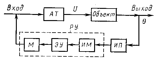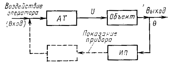 Рисунок 2. Структурная схема системы, представленной на рис. 1. На рис.2 видно, что выход системы ручного регулирования по воздействию связан с её входом через оператора (пунктир рис.1 и 2).Из этого следует общая идея перехода от ручного к автоматического регулированию – подать регулирующее воздействие с выхода системы на её вход через определённое техническое устройство, без человека-оператора Ч-О.