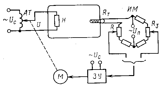 Рисунок 3. Схема автоматической системы регулирования (АСР). На рис. 3 показан переход от ручного регулирования температуры сушительного шкафа (рис.1) к автоматического её регулированию. Температура в сушительном шкафу (рис.3) измеряется термометром сопротивления Rт, включённым в одном из плеч измерительного моста ИМ. При заданном значении температуры измерительный мост уравновешен, на вход электронного усилителя ЭУ напряжение не подаётся. При отклонении температуры от заданного значения соответственно изменяется сопротивление Rт, что вызывает разбаланс измерительного моста ИМ. На электронный усилитель подаётся напряжение разбаланса, и электродвигатель М начинает вращаться, перемещая движок автотрансформатора АТ в сторону ликвидации отклонения температуры шкафа от заданного значения. При достижении заданного значения температуры измерительный мост ИМ балансируется, электродвигатель М останавливается и система приходит в равновесное состояние. Заданное значение температуры устанавливается путём перемещения оператором движка потециометра Rз. Потециометр R служит для коррекции равновесия ИМ при значении температуры в сушильном шкафу, равном заданному.