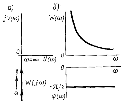 Рисунок 6. Частотные характеристики интегрирующего звена. Частотные характеристики представлены на рис. 6, из которого следует, что а) КЧХ звена W (jw) при изменение w от 0 до совпадает с отрицательной мнимой полуосью (рис.6а); б) при всех частотах выходные колебания отстают по фазе от входных на угол 90 (рис.6в) в) АЧХ представляет собой гиперболу, т.е. чем меньше частота входного сигнала, тем больше этот сигнал усиливается звеном. При w = 0 коэффициент усиления равен бесконечности, и, наоборот, при w = коэффициент усиления звена равен нулю (рис.6б). Логарифмируя W (w) в (7), получаем L (w) = 20 lg k – 20 lg w (9)Таким образом, ЛАЧХ представляет собой прямую линию, пересекающую при k = 0 ось абсцисс в точке w = 1 и имеющую наклон к оси абсцисс 20 дБ / дек. При k 1 ЛАЧХ перемещается параллельно оси ординат на величину 20 l gk (рис.7а)