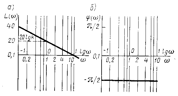 Рисунок 10. Логарифмические частотные характеристики частотного звена. Логарифмическая амплитудно-частотная характеристика (ЛАЧХ) дифференцирующего звена представляет собой прямую (рис. 10а) с наклоном +20 дБ / дек, ордината, которой при w = 1 равна 20 lg k. Фазочастотная характеристика звена в полулогарифмическом масштабе в соответствии с (16) представлена на рис.10б. Примером дифференцирующего звена может служить тахогенератор, если за его входную величину принять угол поворота его вала ВХ, а за выходную величину – напряжение UВЫХ тахогенератора, т.к. последнее пропорционально угловой скорости wВЫХ, которая, в свою очередь, равна производной от угла поворота UВЫХ = kВХ = k dВХ / dt. Реальное интегрирующее звено. В динамическом отношении реальное интегрирующее звено определяется дифференциальным уравнениемT d2xВЫХ / dt2 + dxВЫХ / dt = k xВХ (18)Передаточная функция звенаW (p) = k / p (T p + 1) (19)Из этого выражения следует, что реальное интегрирующее звено можно рассматривать как последовательное соединение идеального интегрирующего и апериодического звеньев. Коэффициент k реального интегрирующего звена равен коэффициенту передачи идеального интегрирующего звена. Постоянная времени Т определяет инерционность процесса интегрирования. При этом чем меньше Т, тем больше по своим свойствам реальное интегрирующее звено приближается к идеальному интегрирующему. Примером реального интегрирующего звена может служить электро двигатель, если в динамическом отношении нельзя пренебречь его электромеханической инерцией. В этом случае связь между напряжением двигателя uВЫХ и его углом поворота ВЫХ определяется дифференциальным уравнением TM d2ВЫХ / dt2 + dВЫХ / dt = k uВХ (20)где ТM – постоянная времени, определяемая инерционностью якоря двигателя и перемещаемых этим двигателем масс; k – коэффициент передачи двигателя по каналу: подводимое напряжение к двигателю – угловая скорость двигателя. Из выражения (20) следует, что в рассматриваем случае в динамическом отношении электродвигатель является реальным интегрирующим звеном и его передаточная функция определяется выражением (19).