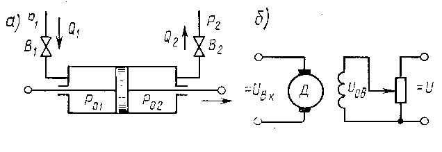 Рисунок 8. Примеры интегрирующих звеньев. Сила давления на поршень равна p = (p01 - p02) F, где F- эффективная площадь поршня. Если пренебречь трением и инерцией поршня. То можно считать, что это усилие целиком расходуется преодоление внешней нагрузки, приложенной к поршню (сопротивление перемещению регулирующего органа, заслонки, шибера и т.п.): рВ.Н = (p01 - p02) F (10) При небольших отклонениях от состояния равновесия расходы жидкости через вентили В1 и В2 пропорциональны перепадам давления на вентилях Q1 = k1 (p1 - p01); Q2 = k2 (p02 - p2) (11) Так как Q1 = Q2 , то решив совместно уравнения (10) и (11), получим p01 = [(F (k1 p1 + k2 p2) + k2 рВ.Н )] / F (k1 + k2) (12) Поступление жидкости за бесконечно малый отрезок времени в левую полость исполнительного механизма при расходе Q1 составляет Q1 dt. За счёт этого поршень перемещается на величину dsВЫХ. Так как объём поступившей жидкости равен приращению объёма левой полости исполнительного механизма, то Q1 dt = F dsВЫХ или dsВЫХ / dt = Q1 / F1. Подставив в это выражение из (11) значение Q1, с учётом (12) получим dsВЫХ / dt = [k1 k2 F (p1 - p2) - k1 k2 fВ.Н] / F2 (k1 + k2) (13) В этом случае, если можно пренебречь величиной внешней нагрузки рв.н. Уравнение примет вид dsВЫХ / dt = k PВХ, где k = [k1 k2 / (k1 + k2)] / F; PВХ = p1 - p2; k – коэффициент передачи интегрирующего звена, значение которого можно изменять в широких пределах с помощью вентилей В1 и В2. Таким образом дифференциальное уравнение гидравлического исполнительного механизма имеет вид dxВЫХ / dt = k xВХ ; следовательно, в динамическом отношении он является динамическим звеном. Дифференцирующее звено.Выходная величина дифференцирующего звена пропорциональна производной по времени от входной величины:xВЫХ = k dхВХ / dt (14)Передаточная функцияW (p) = k p. (15)Из выражения хВЫХ = k dхВХ / dt следует, что выходная величина дифференцирующее звена пропорциональна скорости изменения входной величины, Если входная и выходная величина имеют одинаковую размерность, то коэффициент k выражается в секундах. В этом случае его принято обозначать Т и называть постоянной времени дифференцирующего звена.Частотные характеристики идеального дифференцирующего звена с придаточной функцией W (p) = k p имеют вид