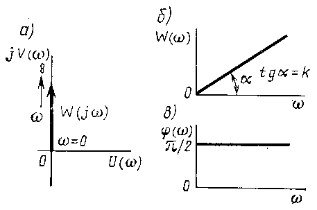 Рисунок 9. Частотная характерика дифференцирующего звена. В комплексной показательной форме W (i w) = w k e j / 2. Эти характеристики представлены на рис. 9. Комплексная частотная характеристика дифференцирующего звена совпадает с положительной мнимой полуосью (рис.9а). При всех частотах выходные колебания опережают по фазе входные колебания на угол 90, т.к. фазочастотная характеристика не зависит от частоты и равна / 2 (рис.9в). Амплитудно-частотная характеристика W (w) имеет вид прямой линии, проходящей через начало координат под углом a = arctg k. Чем больше частота входных колебаний, тем больше они усиливаются звеном. При малых частотах (w = 0) сигнал через звено не проходит (рис.9б). Скачкообразное единичное изменение входной величины вызывает мгновенное изменение выходной величины от 0 до и мгновенный спад её от до 0. Логарифмируя W (w) в выражении (16), получаем L (w) = 20 lg k + 20 lg w (17)