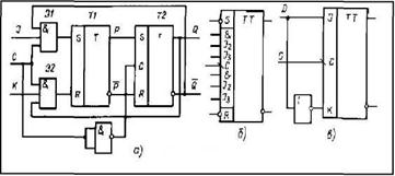 1 с выхода На рис.11,б приведено изображение JK- триггера с тремя объединенными конъюнкцией входами J, с тремя объединенными конъюнкцией входами K и с входами S и R асинхронной установки. На рис. 11,в показана реализация D-триггера на базе JK-триггера.