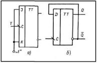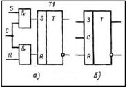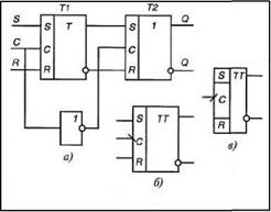 Тактируемый RS-триггер (рис.5,а). Схема такого триггера (собранного на элементах ИЛИ-НЕ) содержит асинхронный RS-триггер T1 и два конъюнктура входной логики. Последние передают переключающую логическую 1 с информационного S- или R-входа на соответствующие входы Т1 только при наличии на синхронизирующем входе С логической 1. При С=0 информация с S- и R-входов на триггер Т1 не передается. Рассматриваемый триггер может быть выполнен и на запоминающей ячейке, реализованной на элементах И-НЕ. Условное изображение тактируемого триггера приведено на рис. 5,б. В тексте тактируемый RS-триггер сокращенно обозначают как RSC-триггер. Синхронизирующие входы триггера могут быть статическими и динамическими. Статический вход не теряет своего управляющего действия, пока на нем присутствует тактовый (синхро) импульс. Такие входы имеет триггер, изображенный на рис. 5,а. В присутствии тактового импульса эти триггеры будут менять свое состояние при каждой смене комбинаций логических потенциалов на входах S и R. Динамический синхровход воздействует на состояние выходов триггера в момент своего появления (передним фронтом) или окончания (задним фронтом).
