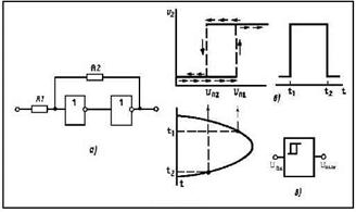 Этот триггер (рис. 13,a) стоит особняком в семействе триггеров: он имеет один вход, один выход и не обладает свойствами запоминающего элемента. Триггер содержит два инвертора, охваченных положительной обратной связью, за счет чего выход схемы может изменять свое состояние лавинообразно. На выходе инвертора потенциал с лог. 0 на лог. 1 изменяется при большем входном напряжении, чем при изменении с лог.1 на лог. 0. Поэтому схема (рис.13,а) обладает гистерезисом (рис. 13,б). Это позволяет использовать ее в качестве формирователя прямоугольных импульсов из входного напряжения, в частности, из синусоидального. Условное изображение триггера Шмитта приведено на рис. 13,в. Литература 1.Калабеков Б.А. Цифровые устройства и микропроцессорные системы —М.: Телеком, 2000г. 2.Потемкин И.С. Функциональные узлы цифровой автоматики —М.: Энергоатомиздат, 1988 г., c. 166…. 206. 3.Сайт в интернете: WWW. abc. WSV.ru 4.Сайты в интернете : rff.tsu.ru, pub. mirea. ac. ru, foroff. phys. msu.ru |
