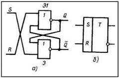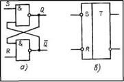 RS-триггер на элементах ИЛИ-НЕ (рис. 2,а). Прежде всего рассмотрим воздействие на такой триггер комбинаций сигналов S=1, R=1 и S=0, R=0. Сочетание S=1, R=1 является запрещенным, так как при нем на обоих выходах триггера устанавливаются логические 0 и после снятия входных сигналов состояние его непредсказуемо. Для элемента ИЛИ-НЕ логический 0 является пассивным сигналом: с его поступлением на вход состояние выхода элемента не изменяется. Поэтому появление комбинации S=0, R=0 не изменяет состояния триггера. Логическая 1 для элемента ИЛИ-НЕ является