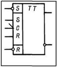 Двухступенчатый тактируемый RS-триггер (рис.6,а). Каждая ступень такого триггера представляет собой тактируемый RS-триггер. При появлении на входе С логической 1 триггер Т1 воспринимает информацию на входах S и R, определяющую его состояние. В это время на С-входе триггера Т2 за счет инвертора — логический 0, и информация с выходов Т1 не воздействует на Т2. В момент окончания действия логической 1 на входе С (С=0) на выходе инвертора появляется логическая 1, разрешающая перезапись в Т2 информации из Т1. Таким образом, в первую ступень информация с входов S и R записывается с поступлением тактового импульса, т. е. по его переднему фронту; состояние первой ступени передается второй с окончанием тактового импульса, т. е. по его срезу. По этому внешнему проявлению тактирующего импульса C-вход описанного триггера можно рассматривать как динамический. Условное изображение двухступенчатого RS-триггера, в котором переключение выходов второй ступени триггера происходит перепадом входного сигнала из 1 в 0 (перепадом 1 / 0), приведено на рис.6,б. Условное изображение триггера с C-входом, переключающим триггер перепадом 0/1, приведено на рис. 6, в. Тактируемый (синхронный) триггер обычно имеет дополнительные асинхронные входы, но которым он вне зависимости от сигнала на тактовом входе переключается в состояние 1 (по входу S) или в 0 (по входу R). Такие входы называют не тактируемыми или асинхронными. Логические потенциалы на них воздействуют на запоминающие ячейки триггера непосредственно (для чего эти ячейки триггера выполнены на трехвходовых элементах), минуя входную логику. Условное изображение двухступенчатого триггера с инверсными асинхронными входами приведено на рис. 7.