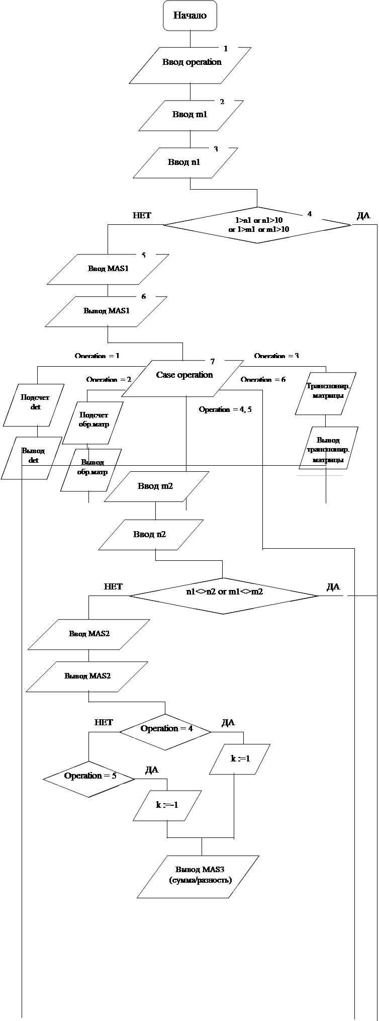 Текст Программы: Program MATRIX; {Наименование программы} Uses CRT; VAR i1, i2, i3 : integer; {Счетчик строк} j1, j2, j3 : integer; {Счетчик столбцов} operation: integer; {Вариант развития программы} det : real; {Определитель}k: integer; {Рабочая переменная} {Массивы (матрицы), используемые в программе} MAS1, {Матрица А} MAS2, {Матрица В} MAS3 : array [1..10,1..10] of real; {Матрица С} BEGIN {Начало программы} WriteLn ('Что Вы желаете делать с матрицами?'); {Выбор пользователем варианта развития программы} WriteLn ('Если Вы желаете найти определитель матрицы, нажмите 1'); WriteLn ('Если Вы желаете найти обратную матрицу, нажмите 2'); WriteLn ('Если Вы желаете транспонировать матрицу, нажмите 3'); WriteLn ('Если Вы желаете сложить матрицы, нажмите 4'); WriteLn ('Если Вы желаете вычесть матрицы, нажмите 5'); WriteLn ('Если Вы желаете перемножить матрицы, нажмите 6'); ReadLn (operation); {Занесение выбранного варианта в память} WriteLn ('Введите кол-во строк исходной матрицы, не более 10'); ReadLn (m1); WriteLn ('Введите кол-во столбцов исходной матрицы, не более 10'); ReadLn (n1); If ((1>n1) or (n1>10) or (1>m1) or (m1>10)) {Условия ошибки} then begin WriteLn ('ОШИБКА!!!'); Halt; end else begin WriteLn ('Введите исходную матрицу'); {Ввод исходной матрицы} for i1:=1 to m1 do for j1:=1 to n1 do Read (MAS1[i1,j1]); end; for i1:=1 to m1 do {Вывод исходной матрицы} begin for j1:=1 to n1 do Write (MAS1[i1,j1]); WriteLn; end; Case operation of {Оператор выбора «operation»} 1: begin {Определитель} if (m1<>n1) then writeLn ('ОШИБКА!!!') {Условие ошибки} else begin {Формула определителя} det:=(MAS1[1,1]*MAS1[2,2]*MAS1[3,3] +MAS1[2,1]*MAS1[3,2]*MAS1[1,3] +MAS1[1,2]*MAS1[2,3]*MAS1[3,1]) -(MAS1[3,1]*MAS1[2,2]*MAS1[1,3] +MAS1[3,2]*MAS1[2,3]*MAS1[1,1] +MAS1[2,1]*MAS1[1,2]*MAS1[3,3]); WriteLn ('Opredelitel det=',det); {Вывод определителя} end; end; 2: begin {Обратная матрица} if (m1<>n1) then WriteLn ('ОШИБКА!!!') {Условие ошибки} else begin det:=(MAS1[1,1]*MAS1[2,2]*MAS1[3,3] {Определитель} +MAS1[2,1]*MAS1[3,2]*MAS1[1,3] +MAS1[1,2]*MAS1[2,3]*MAS1[3,1]) -(MAS1[3,1]*MAS1[2,2]*MAS1[1,3] +MAS1[3,2]*MAS1[2,3]*MAS1[1,1] +MAS1[2,1]*MAS1[1,2]*MAS1[3,3]); if det = 0 then WriteLn ('ОШИБКА!!!') {Условие ошибки} else begin {Союзная матрица} for i1:=1 to m1 do for j1:=1 to n1 do MAS2[i1,j1]:=MAS1[j1,i1]; {Итоговая формула} for i1:=1 to m1 do for j1:=1 to n1 do MAS3[i1,j1]:=(1/det)*MAS2[i1,j1]; WriteLn; WriteLn ('Обратная матрица:'); for i1:=1 to m1 do begin {Вывод обратной матрицы} for j1:=1 to n1 do Write (MAS3[i1,j1]); WriteLn; end; end; end; end; 3: begin {Транспонирование матрицы} for i1:=1 to m1 do for j1:=1 to n1 do MAS2[i1,j1]:=MAS1[j1,i1]; {Формула} WriteLn ('Транспонированная матрица: '); for i1:=1 to m1 do begin {Вывод транспонированной матрицы} for j1:=1 to n1 do Write (MAS2[i1,j1]); WriteLn; end; end; 4,5: begin {Сложение/вычитание матриц} {Ввод второй матрицы} WriteLn ('Введите кол-во строк второй матрицы'); ReadLn (m2); Writeln ('Введите кол-во столбцов второй матрицы'); ReadLn (n2); If (n2<>n1) or (m2<>m1) then WriteLn ('OSHIBKA!!!') {Условие ошибки} else begin WriteLn ('Введите вторую матрицу'); for i1:=1 to m1 do for j1:=1 to n1 do Read (MAS2[i1,j1]); end; for i1:=1 to m1 do {Вывод второй матрицы} begin for j1:=1 to n1 do Write (MAS2[i1,j1]); WriteLn; end; if operation = 4 then k := 1; if operation = 5 then k := -1; for i1:=1 to m1 do for j1:=1 to n1 do MAS3[i1,j1]:=MAS1[i1,j1]+k*MAS2[i1,j1]; {Итоговая формула} writeln('Сумма/разность:'); for i1:=1 to m1 do begin for j1:=1 to n1 do Write(MAS3[i1,j1]); WriteLn; end; end; 6: begin {Умножение матриц} {Ввод второй матрицы} WriteLn ('Введите кол-во строк второй матрицы'); ReadLn (m2); Writeln ('Введите кол-во столбцов второй матрицы'); ReadLn (n2); If ((1>=m2) or (m2>=10) or (1>=n2) or (n2>=10) {Условие ошибки} or (n2<>m1)) then WriteLn ('ОШИБКА!!!') else begin WriteLn ('Введите вторую матрицу'); for i2:=1 to m2 do for j2:=1 to n2 do Read (MAS2[i2,j2]); end; for i2:=1 to m2 do begin {Вывод второй матрицы} for j2:=1 to n2 do Write (MAS2[i2,j2]); WriteLn; end; m3:=m1; n3:=n2; for i3:=1 to m3 do for j3:=1 to n3 do begin MAS3[i3,j3] := 0; for i2:= 1 to m2 do {Итоговая формула} MAS3[i3,j3] :=MAS3[i3,j3] + MAS1[i3,i2] * MAS2[i2,j3]; end; begin {Вывод произведения} writeln; writeln('Произведение:'); for i3:=1 to m1 do begin for j3:=1 to n2 do Write (MAS3[i3,j3]); WriteLn; end; end; end; End; {End Case} ReadKey; END. {Конец программы} Пример работы программы 1. Операция нахождения определителя: 1) При появлении на экране меню с выборо