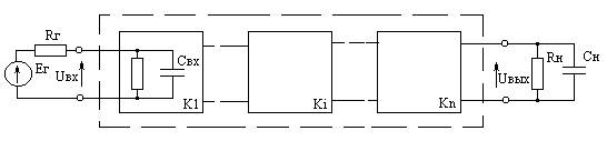 Рисунок 2.1 - Структурная схема усилителя K - коэффициент усиления, дБ; Ki - коэффициент усиления i-го каскада, дБ; i = 1,...,n; n - число каскадов. Для ШУ диапазона ВЧ с временем установления порядка десятков наносекунд ориентировочно число каскадов можно определить, полагая, что все каскады с одинаковым Ki равным 10 децибел, то есть: