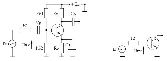 Рисунок 3.1 – Принципиальная и эквивалентная схемы резистивного каскада1) Найдем ток и напряжение в рабочей точке:
