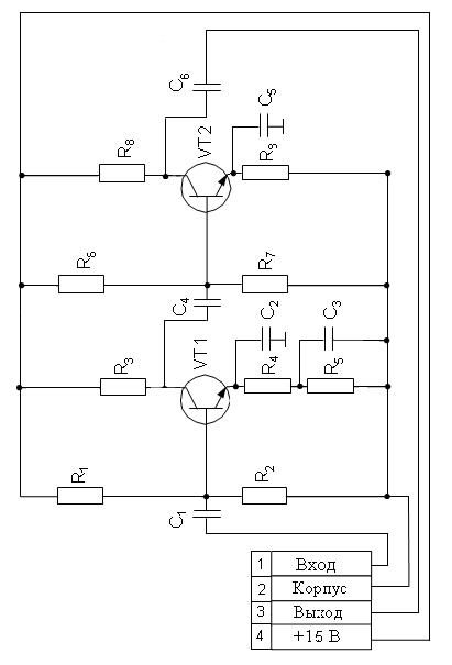 1 ВведениеСейчас в электронной технике часто используются разнообразные усилительные устройства. В любом теле-радиоустройстве, в компьютере есть усилительные каскады.В данном курсовом проекте решается задача проектирования усилителя напряжения на основе операционных усилителей. Операционный усилитель (ОУ) – усилитель постоянного тока с полосой пропускания в несколько мегагерц с непосредственной связью между каскадами (т.е. без Ср), с большим коэффициентом усиления, высоким входным и малым выходным сопротивлениями, а также низким уровнем шума, при хорошей температурной стабильности, способный устойчиво работать при замкнутой цепи обратной связи (ОС). ОУ предназначен для выполнения различных операций над аналоговыми величинами, при работе в схеме с глубокими отрицательными обратными связями (ООС). При этом под аналоговой величиной подразумевается непрерывно изменяющееся напряжение или ток Основной целью данного курсового проекта является разработка широкополосного усилителя. В задачу входит анализ исходных данных на предмет оптимального выбора структурной схемы и типа электронных компонентов, входящих в состав устройства, расчёт цепей усилителя. По заданию усилитель должен усиливать сигнал в полосе частот от 4 до 40 МГц с частотными искажениями не более 2 дБ на верхних и 3дБ нижних частотах. Нелинейные искажения усилителя необходимо оценить. 2 Расчет структурной схемы усилителя 2.1 Определение числа каскадов Чтобы обеспечить амплитуду выходного сигнала, заданную в техническом задании, нужно выбрать многокаскадный усилитель, так как одного усилительного элемента недостаточно. Поэтому определим число каскадов для обеспечения выходного сигнала. Структурную схему многокаскадного усилителя можно представить как
