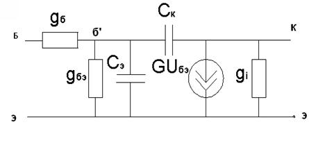 Рисунок 3.5 - Активная коллекторная термостабилизация Для расчета схемы термостабилизации необходимо сначала выбрать напряжение на резисторе Rк, а затем рассчитать токи и напряжения на втором транзисторе, и следующим шагом рассчитать значения элементов схемы: 1) 2) Uкэ0vt2=Uкэ0vt1/2 = 6В/2 = 3В (3.34) 3) URб2=Uкэ0vt2-0,7В = 3В-0,7В = 2,3В (3.35) 4) Iк02=Iб01=110мА (3.36) 5) Iк01=Iб01*β01=110мА*100 = 11А (3.37) 6) Rб2=URб2/Iк02=2,3В/110мА = 20,9Ом (3.38) 7) Uб2=Uкэ0vt1-0,7В=6В-0,7В = 5,3В (3.39) 8) Iдел=10Iбо2=110мА*10/100 = 11мА (3.40) 9) R1=Uб2/Iдел=5,3В/11мА = 481,818Ком (3.41) 10) R3= UR2/Iдел=(1+0,7)В/11мА =1 54,545Ом (3.42) Из рассмотренных схем видно, что наиболее эффективной будет схема с эмиттерной термостабилизацией, т.к. каскад выходной и следовательно мощный, и диапазон усиливаемых частот не очень большой, то нет необходимости в другом виде термостабилизации. 3.4 Расчёт эквивалентной схемы замещения При использовании транзисторов до (0,2 - 0,3)fт возможно применение упрощенных эквивалентных моделей транзисторов, параметры элементов эквивалентных схем которых легко определяются на основе справочных данных. Эквивалентная схема биполярного транзистора представлена на рисунке 3.6.