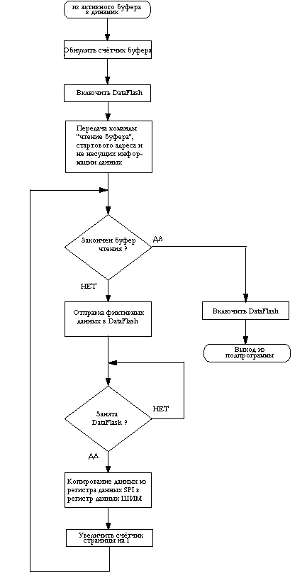 Запись данных в DataFlash производится путём записи сначала в буфер, а, когда этот буфер будет заполнен, его содержимое запишется в одну страницу главной памяти. В подпрограмме «write_to_flash» переменная «j» соответствует номеру байта в буфере, а переменная «k» номеру страницы, в которую будет записываться содержимое буфера. Если флаг новых данных показывает, что DataFlash пуста, то оба счётчика устанавливаются в нуль. Если память уже содержит некоторые данные, то переменные показывают следующее свободное место в памяти, и гарантируют, что новые данные добавятся к содержимому памяти. Для того чтобы защитить содержимое этих переменных при двух вызовах функций, они объявляются статическими переменными. Для записи данных в буфер, линия #CS переводится в низкое состояние и в DataFlash загружается операционный код 0x84. Это следует за 14 не имеющими смысла битами и 10-битовым адресом положения внутри буфера. Затем вводятся 8-бит данных. Эта последовательность передаётся «ведомому» побайтно. После каждого байта проверяется регистр состояния SPI (SPSR), пока флаг прерывания SPI не покажет, что последовательная передача завершена. После записи всей последовательности линия #CS переводится в высокое состояние. Если буфер заполнен и остались пустые страницы, то буфер копируется на следующую страницу DataFlash. Так как память была очищена раньше, то данные могут быть записаны без дополнительного стирания. Если память заполнена, то цикл выполняется, пока нажата кнопка «запись». Любые данные, записанные в то время, когда память уже заполнена, будут потеряны. Воспроизведение В процедуре «воспроизведения», содержимое DataFlash считывается и модулируется как 8-разрядная ШИМ на частоте 15.686 Гц. Для достижения большей скорости, данные не читаются напрямую из основной памяти, а передаются в один из двух буферов и затем читаются из буфера. В это время копируется следующая страница памяти в другой буфер. Для ШИМ, 16-разрядный Таймер/Счётчик 1 используется с выходом ШИМ на OC1B. Это описывается в регистре управления Таймера/Счётчика A и B (TCCRA/TCCRB). Для запуска ШИМ с возможной наибольшей частотой, делитель тактовой частоты ШИМ устанавливается в 1. Когда установка завершена, первая страница копируется в буфер 1, посредством перевода линии #CS в низкое состояние и передачей соответствующих команд в DataFlash. Передача страницы в буфер начинается, когда линия #CS переводится снова в высокое состояние. Когда состояние на выводе Ready/Busy меняется памятью DataFlash на высокое, то это означает, что буфер 1 содержит действительные данные. Затем начинается передача следующей страницы в буфер 2. Так как оба буфера независимы друг от друга, то данные могут всегда читаться из буфера 1, пока DataFlash остаётся занятой копированием данных из второй страницы в буфер 2. Для чтения байта из буфера, в DataFlash должна быть записана фиктивная величина. Операция записи «ведущего» в SPI «ведомого» приводит к тому, что содержимое его регистра данных SPI (SPDR) будет изменено. После записи фиктивного байта в DataFlash, регистр SPDR микроконтроллера AVR содержит выходные данные из DataFlash.