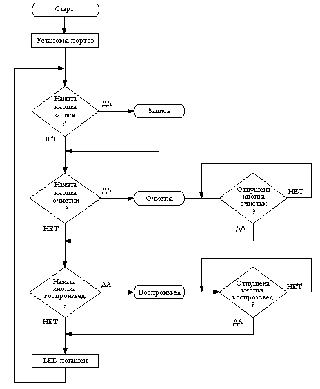 for(;;) { if (!(PIND & 8)) // если кнопка записи нажата (кнопка 3) { PORTB &= 0xF7; // зажигаем LED recording(); } if (!(PIND & 4)) // если нажата кнопка очистки (кнопка 2) { PORTB &= 0xF7; // зажигаем LED erasing(); while (!(PIND & 4)); // ждём пока кнопка очистки не отпущена (кнопка 2) } if (!(PIND & 2)) //если нажата кнопка воспроизведения(кнопка 1) { PORTB &= 0xF7; // зажигаем LED playback(); while (!(PIND & 2)); // ждём пока кнопка воспроизведения не отпущена (кнопка 1)