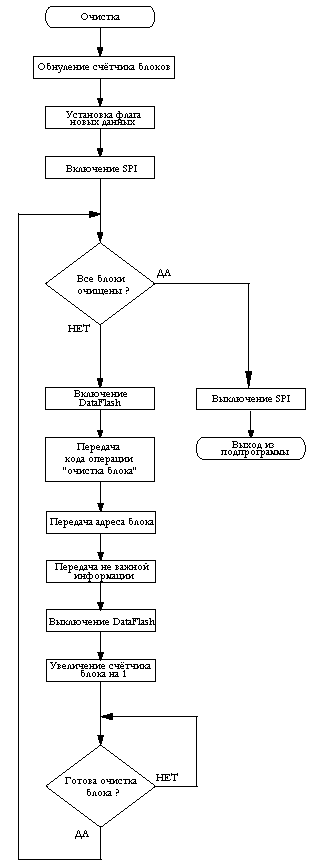 while (block_counter < 512) PORTB &= ~DF_CHIP_SELECT; // включение DataFlash SPDR = BLOCK_ERASE; while (!(SPSR & temp)); // ожидание завершения передачи SPDR = (char)(block_counter>>3); while (!(SPSR & temp)); // ожидание завершения передачи SPDR = (char)(block_counter<<5); while (!(SPSR & temp)); // ожидание завершения передачи SPDR = 0x00; // не важно while (!(SPSR & temp)); // ожидание завершения передачи PORTB SPCR = 0x00; //отключение SPI