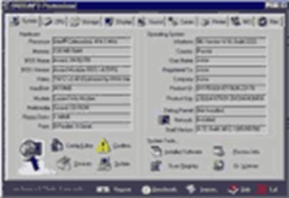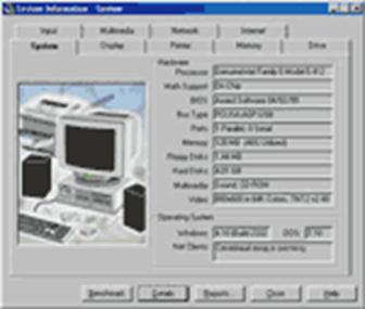 Norton Utilities Среди пакетов сервисных утилит, без сомнения, "первым среди равных", является Norton Utilities выпускаемый фирмой Symantec и уже доросший до 2002-й версии. Входящая в пакет утилита System Information предоставляет удобно сгруппированную информацию по всем основным компонентам компьютера. Имеется возможность детализации информации по некоторым разделам, а так же сформировать отчет. Довольно наглядно и красочно, с использованием круговых диаграмм, оформлена информация об эффективности и использовании диска. Протестировать процессор можно, нажав кнопку Benchmark. Программа выдает график примерного быстродействия Вашей системы, за единицу измерения принимается производительность РС на базе процессора Intel 386SX-16MHz. Для сравнения даны рейтинги трех различных компьютеров. При всем моем уважении к действительно великолепному пакету Norton Utilities 2001, утилита System Information является весьма посредственным инструментом для получения исчерпывающей информации о компонентах системы, плюс к этому не очень наглядно, особенно в сравнении с двумя нижеописанными программами, отображаются сведения о системе, ну и совсем добивает своей примитивностью и не внушающими доверия результатами, тестовая подсистема программы. Результат - не более чем удовлетворительно.