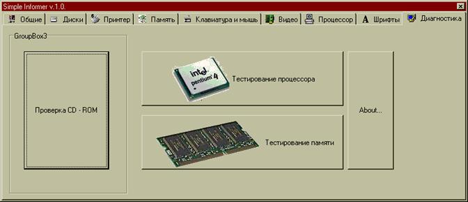 Разработать утилиту диагностики и тестирования основных устройств ЭВМ. Данная утилита предназначена для определения и тестирования основных устройств ЭВМ, таких как жесткий диск, центральный процессор, оперативная память и т.д. Системные требования к программе: · Intel 486DX 50 MHz и выше. · ОС Windows 95 / 98 / 2000 / ХР. · ОЗУ 16 Mb. ·