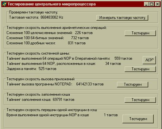 при нажатии на кнопку тестирования процессора выпадает нижеуказанное окно, где производится тестирование процессора. здесь, можно потестировать очень много параметров. Перечислим наиболее главные из них: -тактовая частота – здесь применяется встроенный в микропроцессор счетчик тактов, с которого мы получаем текущую тактовую частоту -скорость выполнения арифмеических операций – здесь мы тестируем, насколько быстро процессор выполняет основные арифметические операции с различными типами данных -скорость системной шины – здесь мы проверяем скорость шины между процессором и памятью, т.е. за сколько тактов передается информация между ними. Используется инструкции НОП, расположенные в первом случае в оперативной памяти, а во вотром случае – в кэш-памяти. В конце программа вычисляет задержку памяти, т.е. сколько тактов требуется именно на передачу данных из / в память . -скорость вызова приложений – здесь тестируем, за сколько тактов вызывается в оперативнюу память стандартная программа Блокнот -скорость заполнения кэша – тама мы заполняем все 256 или 512 килобайтов кэша инструкциями, и смотрим, за сколько тактов он заполнится.