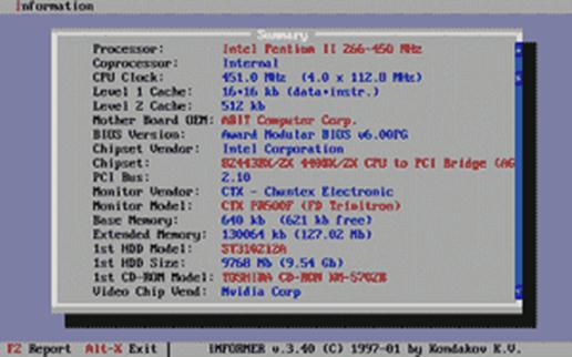 Informer Informer 3.40 - очень неплохая отечественная разработка, предназначенная для анализа конфигурации компьютера и выдающая по ней подробный отчет. Программа предоставляет довольно широкие возможности анализа, так, по заявлениям разработчика, имеется возможность определения 110 типов процессоров и 19 - сопроцессоров, причем измерение тактовой частоты осуществляется с точностью 0.1МГц. Распознаются 2574 моделей мониторов, 324 производителей материнских плат, большое количество различных накопителей и AGP/PCI-устройств и определяются режимы их работы. Как недостаток можно отметить полное отсутствие возможности оценить производительность отдельных компонентов системы. Программа Informer предназначена для использования под управлением ОС DOS, поэтому ей присущи все издержки примитивного псевдографического интерфейса, но это в какой-то мере компенсируется очень скромными ее размерами - всего 200 Kb, что позволяет использовать утилиту с обычной дискеты. Informer, кроме DOS, прекрасно работает и под Windows 95/98/Ме. Распространяется бесплатно. Итоговую оценку можно определить как хорошо. Cool Info