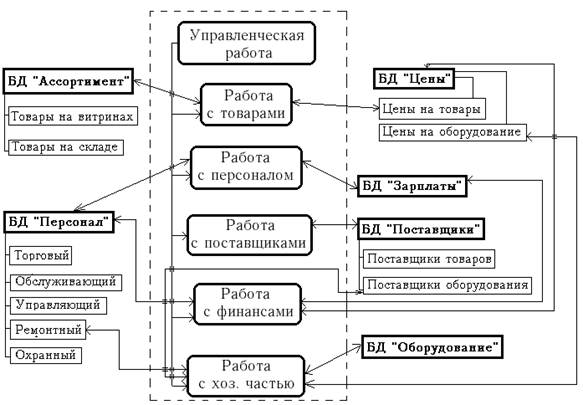Центром любой подобной АСУ всегда является мощный энергонезависимый сервер, хранящий информацию о деятельности всех подсистем супермаркета в виде совокупности распределенных баз данных. Каждая база данных содержит одну или несколько информационных таблиц, содержание которых определяется названием БД и может различаться по внутренним характеристикам; одна и та же база данных может использоваться для работы различных подсистем путем выделения из нее соответствующей информационной таблицы. Из-за некритичности рассматриваемой АСУ во времени (определенные задержки в выполнении тех или иных операций не грозят системе аварийным сбоем и не подвергают опасности жизнь людей) система не содержит объединенного пульта управления, информация на который выводится со всех интегрированных подсистем и подвергается посекундному контролю опытных операторов; вместо этого каждая из подсистем включает в себя определенное количество оборудованных дисплеями оконечных рабочих мест, выводящиеся на которые и снимаемая с которых информация строго систематизирована по своему характеру. Каждая из подсистем супермаркета включает в себя программное и аппаратное обеспечение, обеспечивающие: 1) извлечение данных из БД, связанных с соответствующей подсистемой; 2) запись в БД измененных или новых данных; 3) связь с внешними устройствами, необходимыми для функционирования подсистемы. Разделение супермаркета на подсистемы необходимо для реализации на базе каждой из подсистем определенного подмножества функций, схожих по предметной области; подобное разделение также необходимо с целью организации подразделений АСУ, выполняющих контроль за подотчетной каждому из них подсистемой. Несмотря на то, что подсистемы связаны между собой совместно используемыми базами данных, разделение по предметной области четко определяет круг задач, выполняемых каждой из подсистем. 2. Функции, реализуемые подсистемами АСУ. 1. Работа с товарами. По характеру своей деятельности супермаркет – организация, целью которой является продажа населению продуктов и прочих товаров широкого потребления с целью получения прибыли. В связи с этим естественным представляется отведение большинства реализуемых АСУ функций соответствующей подсистеме.