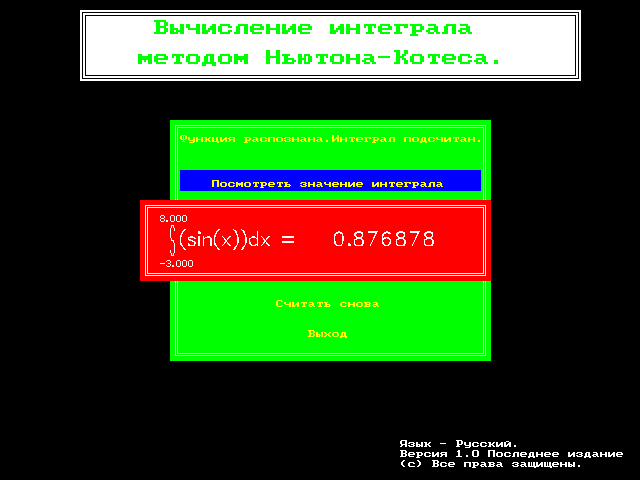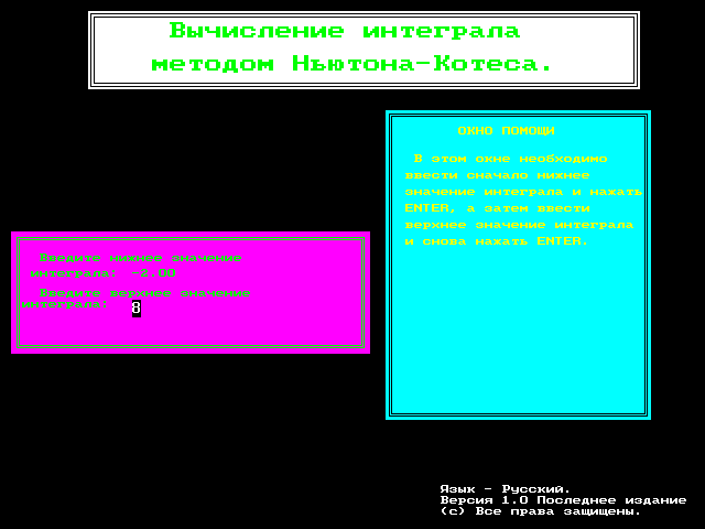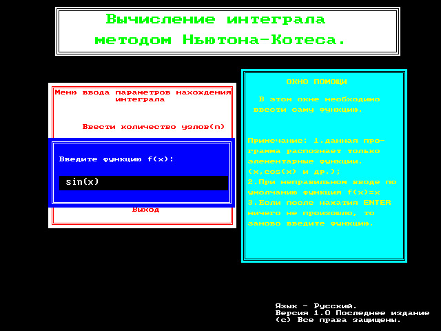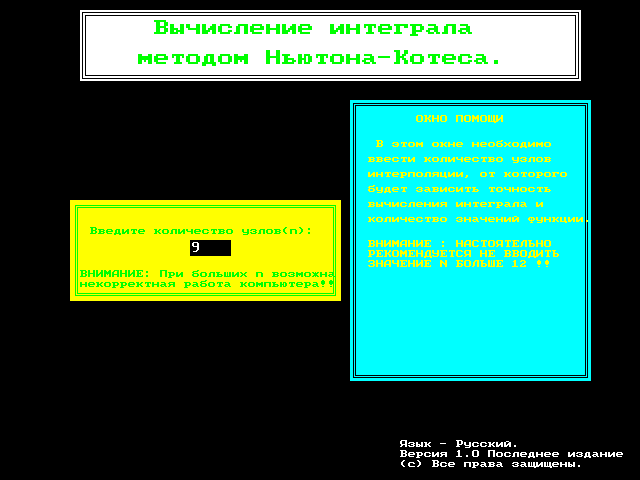 При вводе параметров в “Меню задания параметров нахождения интеграла” желательно их вводить постепенно сверху вниз, т.е. сначала ввести количество узлов интерполяции, затем пределы интегрирования, а уж потом вводить саму функцию.