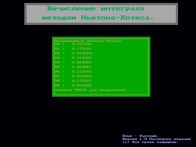 При испытании программы под разные операционные системы(Dos, Windows 98-2k,NT, из под паскаля) происходил непонятный баг с неверным выводом на экран значений коэффициентов Ньютона-Котеса, хотя интеграл считался верно. Для нормального нахождения их желательно запускать программу через Dos.