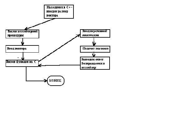 5.3 Модуль на С++ /*Это часть на С++, есть еще на ассемблере*/ #include extern "C" void vvod();/*ассемблерная процедура*/ extern "C" void mnogochlen(int *vec);/*функция в С*/ int m; extern int *vect;/*вектор коэффициентов, объявленный*/ /*внешней переменной*/ main() { cout cin>>m; vvod();/*Вызов ассемблерной процедуры*/ return 0; } extern "C"/*Начало функции на С*/ { void mnogochlen(int *vect) { int i,g,x; int fact,summa; summa=0; cout cin>>x; for(i=m;i>=0;i--)/*Вычисление ответа*/ { fact=1; for(g=0;g { fact=fact*x; } summa=summa+vect[i]*fact; } cout cout } } 5.4 Модуль на ассемблере MODEL small dataseg so db 'введите вектор коэффициентов','$' extrn _m:word, _vec:word; Внешние аргументы m2 dw 0 codeseg extrn _mnogochlen:proc; функция из С++ public _vvod; местная процедура proc _vvod near push bp mov bp,sp push di;Сохранение значений этих регистров push si;необходимо, т.к. они используются С++ MOV ah,09h ;начало ввода вектора перестановок MOV dx,offset so INT 21h mov si,0 MOV cx,[_m] l1: MOV ah,02h MOV dl,'>' INT 21h MOV di,0 m1 : MOV ah,08h INT 21h CMP al,13 JE exit CMP al,'9' JA m1 CMP al,'0' JB m1 MOV ah,02h MOV dl,al INT 21h SUB al,'0' XOR ah,ah MOV m2,ax MOV ax,di MOV bx,10 MUL bx ADD ax,m2 MOV di,ax JMP m1 exit: MOV [_vec[si]],di ADD si,2;Данные типа слово, прибавляем 2 MOV di,0 mov ah,02h mov dl,' ' int 21h mov dl,13 int 21h mov dl,10 int 21h LOOP l1 mov sp,bp pop di;извлечение сохраненных регистров pop si;перед возвратом в С++ MOV ax,offset [_vec] PUSH ax call _mnogochlen; Вызов функции С++ ADD sp,4;Удаление элементов из стека POP bp;адрес возврата ret endp _vvod end 5.5 Анализ проведенной работы При работе в многомодульном режиме главные трудности возникают в использовании регистров. Из-за несохранения системных регистров, используемых С++, программа может просто “повиснуть”. Также следовало сделат выбор - какой модуль сделать главным. Но практика показывает, что следует производить вызов языков низкого уровня из высокого, а не наоборот. В общем, все трудности были преодолены и программа появилась в свет.