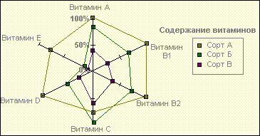 В лепестковой диаграмме каждая категория имеет собственную ось координат, исходящую из начала координат. Линиями соединяются все значения из определенной серии. Лепестковая диаграмма позволяет сравнить общие значения из нескольких наборов данных. Рис 8: Лепестковая диаграмма На этой диаграмме ряд данных, охватывающий наибольшую часть площади (сорт A), представляет сорт с самым высоким содержанием витаминов. Надписи на осяхЕсли Вы не сделали заголовка диаграммы и надписей на осях на пятом шаге работы с «Конструктором», то сделайте это сейчас. Для этого вызовите директиву «Название» из меню «Вставка». В открывшемся диалоговом окне нужно указать место для надписей, которые Вы хотите ввести. Чтобы ввести надпись, нужно включить опциональные кнопки «Название диаграммы», «Значение по оси Y» и «Значение по оси X». Для трехмерных диаграмм появляется еще одна кнопка для надписей на третьей оси. После щелчка по кнопке «Значение по оси Y» на диаграмме появляется текстовая рамка, в которой находится буква Y. Эту букву можно обычным образом заменить любым текстом. Чтобы завершить ввод, нужно щелкнуть кнопкой мыши. На диаграмме появится текст, который можно редактировать и форматировать обычным образом. Для этого нужно лишь щелкнуть по нему мышью, чтобы появилась текстовая рамка.