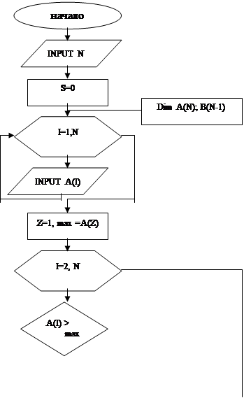 5 CLS 10 INPUT N 20 S = 0 30 DIM A(N): DIM B(N - 1) 40 FOR i = 1 TO N: INPUT A(i): NEXT i 50 Z = 1: MAX = A(Z) 60 FOR i = 2 TO N 70 IF A(i) > MAX THEN MAX = A(i): Z = i 80 NEXT i 90 FOR i = 1 TO N 100 IF i <> Z THEN S = S + 1: B(S) = A(i) 120 NEXT i 130 FOR i = 1 TO N 140 LOCATE 10, i * 3: PRINT A(i) 150 NEXT i 160 FOR i = 1 TO N - 1 170 LOCATE 15, i * 3: PRINT B(i) 180 NEXT i 190 END