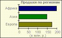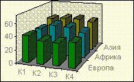 Показанная на рисунке трехмерная диаграмма позволяет сравнить объемы продаж в Европе за каждый квартал с объемами продаж в двух других регионах. Рис 3: Трёхмерная гистограмма · Линейчатая диаграмма отражает соотношение отдельных компонентов. Категории расположены по горизонтали, а значения по вертикали, таким образом, уделяется большее внимание сопоставлению значений и меньшее - изменениям во времени.