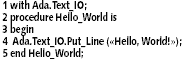 объявления переменной или предложения. Инструкция begin начинает последовательность настоящих команд программы. Предложение_1; и Предложение_1; на самом деле ни чего не значат в Аде; в реальной программе на их месте будут настоящие команды, которые и будут выполнять необходимые нам действия. Предлоджение end Имя_Процедуры; завершает последовательность команд программы. Теперь Я могу сказать вам, что эта маленькая "демо" програмка была нужна, чтобы просто показать вам структуру программы, но теперь мы можем посмотреть и на настоящую рабочую программу. По традиции ей будет, можно сказать, классическая ;-) программа выводящая "Hello World", которая обычно и используется при первом знакомстве с новым языком. with Ada.Text_IO; use Ada.Text_IO; procedure Hello_World is -- А переменные нам здесь не нужны :) begin Put ("Hello world!"); end Hello_World; Пакет "Text_IO"
