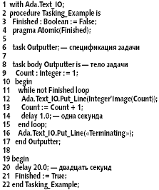 В разделе локальных объявлений процедуры Tasking_Example описывается задача Outputter (строка 6, строки с 8 по 17 содержат тело этой задачи). Когда управление в процессе, соответствующем процедуре Tasking_Example, доходит до строки 20, перед тем, как выполнить этот первый оператор, запускается процесс, соответствующий задаче Outputter, после чего два этих процесса живут и асинхронно выполняются независимо друг от друга. Выполнение оператора задержки (строки 14 и 20) состоит в приостановке соответствующего процесса на указанное количество секунд. Таким образом, процесс Tasking_Example приостанавливается на 20 секунд, а в это время процесс Outputter начинает печатать значения увеличивающегося на единицу счетчика, приостанавливаясь на одну секунду после вывода каждого значения. По истечении 20 секунд процесс Tasking_Example устанавливает флаг Finished в положение "истина", в результате завершается цикл в процессе Outputter. Спецификация переменной Finished как атомарного объекта данных (строка 4) делает невозможным одновременное чтение и изменение значения этой переменной. Далее представлен шаблон функции, позволяющей покомпонентно складывать два одномерных массива. Этот шаблон может быть настроен на произвольный тип, являющийся одномерным массивом, для компонентов которого определены операции присваивания и сложения ("сложение" не обязано быть арифметическим сложением).