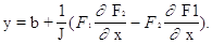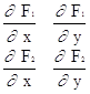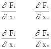 Значения F1,F2,...,Fn и их производные вычисляются при x1=a1, x2=a2,...xn=an. Определителем системы (2) является якобиан: J= Для существования единственного решения системы (2) он должен быть отличным от нуля на каждой итерации. Таким образом, итерационный процесс решения системы уравнений (1) методом Ньютона состоит в определении приращений Dx1, Dx2,... Dxn, к значениям неизвестных на каждой итерации. Счет прекращается, если все приращения становятся малыми по абсолютной величине: max| Dxi|< e. В методе i Ньютона также важен выбор начального приближения для обеспечения хорошей сходимости. Сходимость ухудшается с увеличением числа уравнений системы. В качестве примера рассмотрим использование метода Ньютона для решения системы двух уравнений F1(x,y)=0, (3) F2(x,y)=0. Пусть приближенные значения неизвестных равны a,b. Предположим, что якобиан системы (3) при x=a; y=b отличается от нуля, т.е.: