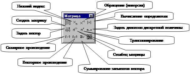 При работе с матрицами используется панель инструментов “Матрицы” Рис.1 Панель инструментов Матрицы Для ввода матрицы: введите имя матрицы и знак присваивания (двоеточие) щелкните по значку “создать матрицу” в панели “Матрицы”.