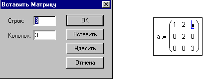 В появившемся диалоге задайте число строк и столбцов матрицы. После нажатия кнопки OK открывается поле для ввода элементов матрицы. Для того, чтобы ввести элемент матрицы, установите курсор в отмеченной позиции и введите с клавиатуры число или выражение. Для того, чтобы выполнить какую-либо операцию с помощью панели инструментов, нужно: выделить матрицу и щелкнуть в панели по кнопке операции, или щелкнуть по кнопке в панели и ввести в помеченной позиции имя матрицы. Меню “Символы” содержит три операции - транспонирование, инвертирование, определитель. Это означает, например, что вычислить определитель матрицы можно, выполнив команду Символы/Матрицы/Определитель. Номер первой строки (и первого столбца) матрицы MathCAD хранит в переменной ORIGIN. По умолчанию отсчет ведется от нуля. В математической записи чаще принято вести отсчет от 1. Для того, чтобы MathCAD вел отсчет номеров строк и столбцов от 1, нужно задать значение переменной ORIGIN:=1. Функции, предназначенные для работы с задачами линейной алгебры, собраны в разделе “Векторы и матрицы” диалога “вставить функцию” (напоминаем, что он вызывается кнопкой на панели “Стандартные”). Основные из этих функций будут описаны позже. Транспонирование