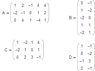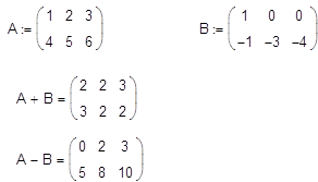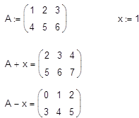 В MathCAD можно как складывать матрицы, так и вычитать их друг из друга. Для этих операторов применяются символы <+> или <-> соответственно. Матрицы должны иметь одинаковую размерность, иначе будет выдано сообщение об ошибке. Каждый элемент суммы двух матриц равен сумме соответствующих элементов матриц-слагаемых.