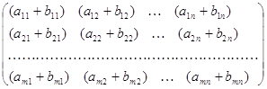 Для обозначения суммы двух матриц используется запись С = А + В. Операция составления суммы матриц называется их сложением. Итак, по определению: