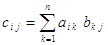 Для обозначения произведения матрицыі на число используется запись С = l A или С = А l. Операция составления произведения матрицы на число называется умножением матрицы на это число. Непосредственно из формулы (1.3) ясно, что умножение матрицы на число обладает следующими свойствами: 1) сочетательным свойством относительно числового множителя: ( l m ) A = l ( m A ); 2) распределительным свойством относительно суммы матриц: l (A + B) = l A + l B; 3) распределительным свойством относительно суммы чисел: (l + m) A = l A + m A Замечание. Разностью двух матриц А и В одинаковых порядков т и п естественно назвать такую матрицу С тех же порядков т и п, которая в сумме с матрицей B дает матрицу A. Для обозначения разности двух матриц используется естественная запись: С = A — В. Очень легко убедиться в том, что разность С двух матриц А и В может быть получена по правилу С = A + (–1) В. Произведение матриц или перемножение матриц. Произведением матрицы A = || a ij || , где (i = 1, 2, ..., m, j = 1, 2, ..., n) имеющей порядки, соответственно равные т и n, на матрицу В = || b ij || , где (i = 1, 2, ..., n , j=1, 2, ..., р), имеющую порядки, соответственно равные n и р, называется матрица С = || c ij || (і =1,2, ..., m; j = 1, 2, ...., р), имеющая порядки, соответственно равные т и р элементы которой определя-ются по формуле: