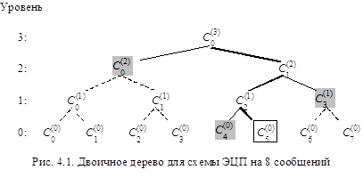 где через A||B обозначен результат конкатенации двух блоков данных A и B, а через H(X) – процедура вычисления хэш-функции блока данных X. При использовании указанного подхода вместе с подписью сообщения необходимо передать не N–1, как в исходном варианте, а только log2N контрольных комбинаций. Передаваться должны комбинации, соответствующие смежным ветвям дерева на пути от конечной вершины, соответствующей номеру использованной подписи, к корню. Пример организации проверочных комбинаций в виде двоичного дерева в схеме на восемь сообщений приведена на рисунке 4.1. Так, при передаче сообщения № 5 (контрольная комбинация выделена рамкой) вместе с его подписью должны быть переданы контрольная комбинация сообщения № 4 (C4(0)), общая для сообщений №№ 6–7 (C3(1)) и общая для сообщений №№ 0–3 (C0(2)), все они выделены на рисунке другим фоном.
