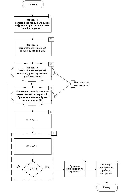 Рисунок 5. Алгоритм шифрования/расшифрования в общем виде. Блок 1 заносит в виртуальный регистр или переменную (обозначим ее как A1) адрес шифруемого/расшифруемого блока данных. Для виртуальной машины этот адрес на самом деле всегда является нулем. Дело в том, что когда происходит выполнение виртуальной инструкции модификации данных, то виртуальная машина добавляет к этому адресу настоящий адрес в памяти и уже с ним производит операции. Можно представить A1 как индекс в массиве шифруемых/расшифруемых данных, адресуемых с нуля. Блок 2 заносит в виртуальный регистр или переменную (обозначим ее как A2) размер блока данных. А2 выполняет роль счетчика в цикле преобразования данных. Заметим, что ее значение всегда в 4 раза меньше, чем настоящий размер шифруемых/расшифруемых данных. Это связано с тем, что полиморфные алгоритмы всегда работают с блоками данных, кратных по размеру 4 байтам. Причем, операции преобразования выполняются над блоками, кратными 4 байтам. О выравнивании данных по 4 байта заботятся более высокоуровневые механизмы, использующие виртуальную машину и полиморфные алгоритмы для шифрования и расшифрования данных. Возникает вопрос, откуда алгоритму "знать", какого размера блок ему необходимо зашифровать, ведь при его генерации такой информации просто нет. Необходимое значение он просто берет из ячейки памяти. Виртуальная машина памяти знает именно об этой ячейке памяти и перед началом выполнения полиморфного алгоритма заносит туда необходимое значение. Блок 3 помещает в виртуальный регистр или переменную (обозначим ее как A3) константу, участвующую в преобразовании. Эта константа, возможно, затем и не будет использована для преобразования данных, все зависит от того, какой код будет сгенерирован. Блок 3 может быть повторен несколько раз. Над данными осуществляется целый набор различных преобразований, и в каждом из них участвуют различные регистры/переменные, инициализированные в блоке 3. Блок 4 можно назвать основным. Именно он, а, точнее сказать, набор этих блоков производит шифрование/расшифрование данных. Количество этих блоков случайно и равно количеству блоков номер 3. При преобразованиях не обязательно будет использовано значение из A3. Например, вместо A3 может использоваться константа или значение из счетчика. На данный момент полиморфный генератор поддерживает 3 вида преобразований: побитовое "исключающее или" (XOR), сложение и вычитание. Набор этих преобразование можно легко расширить, главное, чтобы такое преобразование имело обратную операцию. Блок 5 служит для увеличения A1 на единицу. Как и во всех других блоках эта операция может быть выполнена по-разному, то есть с использованием различных элементарных инструкций виртуальной машины. Блок 6 организует цикл. Он уменьшает значение A2 на единицу, и если результат не равен 0, то виртуальная машина переходит к выполнению четвертого блока. На самом деле управление может быть передано на один из холостых блоков между блоком 3 и 4, но с функциональной точки зрения это значения не имеет. Блок 7 производит проверку ограничения по времени использования алгоритма. Код по проверке на ограничение по времени относится к холостым командам и, на самом деле, может присутствовать и выполнятся в коде большое количество раз. То, что он относится к холостым блокам кода вовсе не з