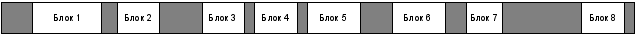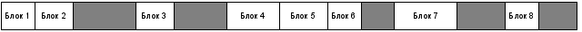 Белым цветом показаны все функциональные блоки. Серым цветом отмечены пустые места, которые будут заполнены произвольными холостыми блоками. Может получиться, например, и такая картина распределения блоков, когда между некоторыми нет промежутка заполняемого холостыми блоками. Такая ситуация показана на рисунке 7.