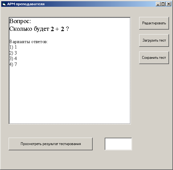 Итак, данная программа позволяет загрузить текст вопроса из файла, отредактировать его и опять сохранить. На практике, естественно, кроме этого должен существовать механизм генерации пакета программ и данных для студента. Т.е. в этот пакет, по всей видимости, должны входить АРМ студента, база данных и т.д. В нашем примере мы это опускаем и предполагаем, что сохраненный текст – все, что необходимо. Эта программа позволяет просмотреть файл с результатом тестирования по заданному вопросу. Это файл генерирует АРМ студента. Он представляет собой файл, в котором записано число – оценка за вопрос. Недостатки данной программы мы рассмотрим чуть ниже, когда познакомимся с АРМ студента. На рисунке 9 показан ее внешний вид.
