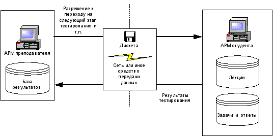 Рисунок 3. В таком случае уязвимым местом становятся такие объекты, как каналы связи между АРМ преподавателя и студента. Возможен вариант взаимодействия между этими АРМами в режиме off-line. Под уязвимыми объектами понимаются различные файлы (например с результатами промежуточного тестирования), с помощь которых и организуется информационное взаимодействие между АРМ. Уязвимы базы лекций, базы с задачами и ответами. Также само программное обеспечение может быть подвержено модификации. На рисунке 4 изображена структурная схема одной из возможной системы дистанционного обучения.