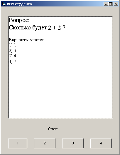 Рисунок 11. Новый интерфейс АРМ преподавателя Рассмотрим, какие изменения понадобилось внести в программу. Их совсем не много. Добавилась глобальная перемеренная obj. Она предназначена для взаимодействия с COM-модулем. Глобальной она быть совсем не обязана, просто это было сделано для краткости программы. Типом этой переменный является указатель на интерфейс IProtect. Но использовать этот интерфейс для шифрования/расшифрования не представляется возможным. Поэтому, в дальнейшем obj будем преобразовывать этот указатель к указателю на интерфейс IProtectFile. Dim obj As New protect Private Sub Edit_Click() Form1.ole_doc.DoVerb End Sub Private Sub Form_Load() Form1.ole_doc.Format = "Rich Text Format" End Sub Данная подпрограмма предназначена для генерации 4 алгоритмов шифрования/расшифрования. Для простоты она записываются во временную папку. Причем, генерируемые алгоритмы будут ограничены в использовании по времени. Файл "c:\temp\crypt.upt" и "c:\temp\decrypt.upt" предназначены для работы с файлом содержащим вопрос. Файл "c:\temp\cryptres.upt" и "c:\temp\decryptres.upt" предназначены для работы с фалом результата. Следовательно для работы АРМ-преподавателя необходимы файлы "c:\temp\crypt.upt" , "c:\temp\decrypt.upt" и "c:\temp\decryptres.upt". А для АРМ-студента необходимы файлы "c:\temp\decrypt.upt", "c:\temp\cryptres.upt". Private Sub Generate_Click() Dim days As Integer days = DaysLimit obj.GenerateTimeLimitUPTfiles "c:\temp\crypt.upt", "c:\temp\decrypt.upt", days obj.GenerateTimeLimitUPTfiles "c:\temp\cryptres.upt", "c:\temp\decryptres.upt", days End Sub Эта подпрограмма фактически является старой подпрограммой загрузки файла с вопросом. Она служит для импорта данных в старом формате чтобы не набирать же вопрос заново. Private Sub Import_Click() Open "c:\temp\temp.rtf" For Input As #1 Dim str, tmp Do While Not EOF(1) Input #1, tmp str = str + tmp Loop Close #1 Form1.ole_doc.DoVerb vbOLEDiscardUndoState Form1.ole_doc.DataText = str Form1.ole_doc.Update End Sub Вот новая подпрограмма чтения текста вопроса из файла. Дадим комментарии к некоторым строчкам. Dim file As IProtectFile – объявляет указатель на интерфейс IProtectFile, который позволяет шифровать/расшифровывать файлы. handle = file.Open("c:\temp\temp.dat", "c:\temp\decrypt.upt", "c:\temp\crypt.upt") – открываем файл с вопросом и сохраняем дескриптор открытого файла. readSize = file.Read(handle, v) – читаем переменную типа Variant, которая на самом деле будет представлять из себя строку. file.Close (handle) – закрывает файл. Private Sub Load_Click() Dim handle As Integer Dim file As IProtectFile Set file = obj handle = file.Open("c:\temp\temp.dat", "c:\temp\decrypt.upt", "c:\temp\crypt.upt") Dim readSize As Long Dim v As Variant readSize = file.Read(handle, v) Dim str As String str = v Form1.ole_doc.DoVerb vbOLEDiscardUndoState Form1.ole_doc.DataText = str Form1.ole_doc.Update file.Close (handle) End Sub Вот как теперь выглядит новая подпрограмма сохранения вопроса в файл. Private Sub Save_Click() Dim handle As Integer Dim file As IProtectFile Set file = obj handle = file.Create("c:\temp\temp.dat", Default, "c:\temp\crypt.upt") Dim writeSize As Long Dim v As Variant Dim str As String str = Form1.ole_doc.DataText v = str writeSize = file.Write(handle, v) file.Close (handle) End Sub И последнее, это новая подпрограмма чтения файлов с результатом тестирования. Private Sub ViewResult_Click() Dim handle As Integer Dim file As IProtectFile Set file = obj handle = file.Open("c:\temp\result.dat", "c:\temp\decryptres.upt", "c:\temp\cryptres.upt") Dim readSize As Long Dim v As Variant readSize = file.Read(handle, v) Dim str As String result = v file.Close (handle) End Sub Внешний вид АРМ студента не изменился. Приведем только текст программы. Dim obj As New protect Private Sub SaveResult(a) Dim handle As Integer Dim file As IProtectFile Set file = obj handle = file.Create("c:\temp\result.dat", Default, "c:\temp\cryptres.upt") Dim writeSize As Long Dim v As Variant Dim str As String str = Form1.ole_doc.DataText v = a writeSize = file.Write(handle, v) file.Close (handle) End End Sub Private Sub Command1_Click(Index As Integer) SaveResult (2) End Sub Private Sub Command2_Click() SaveResult (2) End Sub Private Sub Command3_Click() SaveResult (5) End Sub Private Sub Command4_Click() SaveResult (2) End Sub Private Sub Form_Load() Form1.ole_doc.Format = "Rich Text Format" Dim handle As Integer Dim file As IProtectFile Set file = obj handle = file.Open("c:\temp\temp.dat", "c:\temp\decrypt.upt", "c:\temp\crypt.upt") Dim readSize As Long Dim v As Va