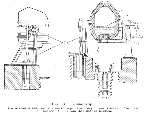 — твердой шихты. Угар металла составляет 1—3% при работе на жидкой шихте и 5—8% на твердой. Число плавок в сутки достигает 3—4 при твердой и 6—8 при жидкой шихте. Электрические дуговые печи емкостью свыше 10 m обычно используют на металлургических заводах, а печи с меньшей емкостью — в сталелитейных цехах для получения фасонных стальных отливок. Составляющими шихты при плавке стали в электрических печах являются стальной лом, чугун, железная руда, флюсы, раскислители и ферросплавы, которые используют для введения легирующих добавок в сталь. Плавку стали ведут основным и кислым процессами. Для плавки стали основным процессом под и стены печи футеруют основными материалами (магнезитовым кирпичом), а для плавки кислым процессом — кислыми материалами (динасовым кирпичом). 10. Технология выплавки стали в Мартеновской сети. Плавка стали в основных мартеновских печах рудным процессом Плавку стали в мартеновских печах ведут рудным процессом на таких металлургических заводах, которые в своем составе имеют доменные печи, но не имеют прокатно-кузнечного производства. При рудном процессе на сталь перерабатывают жидкий чугун, получаемый в доменных печах. Для ускорения окисления примесей чугуна в завалку добавляют чистую железную руду в образующихся окислов загружают известняк. Рудный процесс плавки стали отличается от скраппроцесса тем, что не требуется затрат тепла и времени на расплавление металла и процессы окисления. 11. Технологии выплавки стали в конверторе. Для заливки жидкого чугуна конвертор поворачивают из вертикального положения в горизонтальное. После заливки чугуна пускают дутье и конвертор поворачивают днищем вниз. Слой металла составляет от 1/5 до 1/3 высоты цилиндрической части конвертора. Емкость современных конверторов, работающих на воздушном дутье” достигает до 40 т. В конверторах применяют кислую и основную футеровки. Тепло, необходимое для нагрева жидкой стали до высоких температур, в этих процессах получается за счет химических реакций окисления примесей чугуна. При этом примеси могут окисляться элементарным кислородом и кислородом закиси железа, которая растворяется в металле. При окислении примесей кислородом выделяется значительное количество тепла. При окислении элементов наибольшее количество тепла выделяют кремний, фосфор и марганец. Эти элементы используются при продувке чугуна как источник тепла (кремний в кислом, а фосфор в основном конверторе). Недостаточное количество тепла от реакций компенсируется температурой жидкого чугуна. Для получения стали методом продувки применяют два сорта чугунов: марки Б1 и Б2 — для кислого и Т1 —для основного процессов. Чугун марки Б1 и Б2 содержит минимальное количество фосфора (0,07%) и серы (0,06%), чугун марки Т1 содержит фосфора 1,6—2,0%, а иногда до 2,5%. В последнее время для продувки чугуна вместо воздуха применяют технический кислород, который позволяет повысить скорость плавки, выход годной стали за счет увеличения добавки твердой шихты и уменьшения химических примесей в чугуне, подвергающихся окислению. Конвертор, работающий на кислородном дутье, по конструкции отличается от обычных тем, что имеет сплошное днище и кислороде него во время процесса плавки подается сверху, так как подача кислорода через донные фурмы приводит к быстрому их разрушению. 12. Технолог
