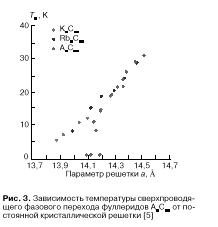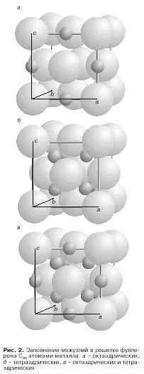 Элементарная ячейка ГЦК – решетки фуллерена (то есть наименьшая часть кристаллической, повторением которой можно воспроизвести весь кристалл) содержит восемь тетраэдрических и четыре октаэдрические пустоты (межузлия). В первом случае центр межузлия окружен четыремя молекулами C60, находящимися в вершинах тетраэдра, во втором – шестью, находящимися в вершинах октаэдра. Октаэдрические пустоты, или межузлия, больше по объему тетраэдрических, поэтому атомы металла прежде всего занимают их. На элементраную ГЦК - ячейку приходятся четыре молекулы фуллерена. При этом необходимо учитывать, что молекулы в вершинах куба – их всего восемь – только на 1/8 принадлежат элементарнйо ячейке, шесть атомов в центре граней куба – на ½ . В результате получаем N= 8* 1/8 + 6*1/2=4. Следовательно, заполнение атомами только октаэдрических пустот должно приводить у фуллериду состава АC60 . эти простые соображения подвергаются на опыте. Последовательные заполнение межузлий в решетке фуллерена атомами металла показано на рис.2. На рис.2, а изображена элементарная ячейка (ГЦК) фуллерена C60 ; как уже указывалось в ней имеются четыре межузлия октаэдрической симметрии и восемь тетраэдрической. При подсчете числа межузлий следует пользоваться тем же методом, который изложен выше для подсчета числа атомов в элементарной ячейке, то есть одно октаэдрическое межузлие находится в центре куба и целиком принадлежит данной элементарной ячейке, в то время как другие, расположенные в центре ребер куба принадлежат данной ячейке только на ¼ и число таких межузлий приходящихся на данную ячейку, оказывается 12* ¼ = 3, то есть всего 1+3 = 4. Тетраэдрических межузлий, имеющих координаты ( ¼ a, ¼ b, ¼ c); ( ¾ a, ¾ b, ¾ c) и т.д., всего восемь, и они находятся внутри ГЦК элементарной ячейки. Октаэдрические пустоты имеют больший объем, поэтому в первую очередь атом металла занимает именно эти межузлия, не оказывая существенного воздействия на параметры решетки фуллерена. Если все октаэдические пустоты заполняются, то это будет соответствовать составу А C60 (рис.2, а). Если бы была возможность заполнить только тетраэдрические пустоты, мы получили бы соединение А2 C60 (рис.2,б), но трудно представить, что атомы металла будут заполнять только тесные тетрамежузлия, оставляя пустыми просторные октаэдрические. Наконец, если заполнить все межузлия атомами металла, то получим соединение А3 C60 (рис.2,в). Дальнейшее увеличение атомов металла приводит к перестройке кристаллической структуры, при этом устойчивым соединением, как указывалось является А6 C60 . это не означает, что индекс n металла может принимать только значения равные 1,3,6 . Просто с этими значениями n получаются упорядоченные структуры или, говорят, стехиометрические составы металлофуллеренов. Может оказаться и так, что при полностью занятых октаэдрических межузлиях атомы металла (сверхстехиометрические) занимают часть тетраэдрических. В этом случае можно говорить о дефектных кристаллах А C60 или А3 C60 в зависимости от того, какая часть тетраэдрических межузлий (меньше или боьше половины) занята атомами металла. Таким образом, фуллерен и его производные - фуллериды имеют широко распространенные в мире неорганических минералов кристаллические решетки, что значительно облегчает анализ их свойств по сравнению с другими органическими материалами. От