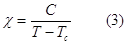 где М – намагниченность или магнитный момент единицы объема; c - магнитная восприимчивость; Н – напряженность внешнего магнитного поля. Вследствие того что при охлаждении ферромагнетика вблизи температуры фазового перехода Тс происходит образование обменно – связанных групп атомов или молекул (кластеров) с большим магнитным моментом, восприимчивость резко увеличивается. Дальнейшее понижение температуры (Т < Тс) приводит к уменьшению восприимчивости, поскольку при Т = Тс происходит полная магнитная поляризация образца и его намагниченность не так активно реагирует на внешнее магнитное поле. В области парамагнетизма, то есть при температурах выше Тс магнитная восприимчивость ферромагнетика зависит от температуры в соответствии с законом Кюри - Вейсса: