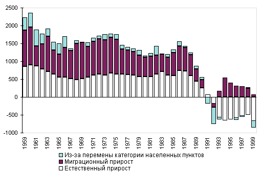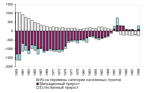 Рис. 1. Компоненты прироста (убыли) городского населения России, 1959-1999, тыс. человек Одновременно значительно сократилась доля горожан, проживающих в поселках городского типа. Общее число таких поселений, постоянно возраставшее ранее, достигнув в 1991 г. 2204, сократилось к началу 2000 г. до 1875, а численность проживающих в них - соответственно с 13,8 до 11,2 млн. человек. Большая часть поселков городского типа была преобразована в сельские поселения, некоторые были включены в черту ближайших городов 3, а некоторые просто упразднены. Вплоть до начала 1990-х гг. рост городского населения в России происходил за счет трех составляющих: превышения числа родившихся над числом умерших, превышения числа прибывших в городские поселения над числом выбывших из них и административно-территориальных преобразований, в результате которых многие сельские жители, никуда не выезжая, становились горожанами (рис. 1). Начавшаяся в 1992 г. естественная убыль городского населения явилась основным фактором уменьшения численности горожан. Большую роль сыграло и преобразование городских поселений в сельские населенные пункты, принявшее массовый характер в 1991-1992 и 1999 гг. Одновременно шли и обратные процессы: в 1998 г. в Ставропольском крае появился новый город - Михайловск - с численностью населения почти 50 тыс. человек, в 1999 г. - Волосово (11 тыс. чел.) в Ленинградской области. Миграционный отток из городских поселений, наблюдавшийся в 1991-1992 гг., усугубил сокращение городского населения России.